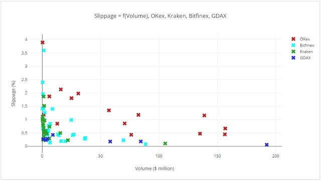 É uma representação da média de slippage e volume de todos os pares de uma seleção de criptomoedas com um volume diário superior a US$ 100 mil em quatro grandes corretoras: OKex, Kraken, Bitfinex e GDAX, ao longo de 24 horas.