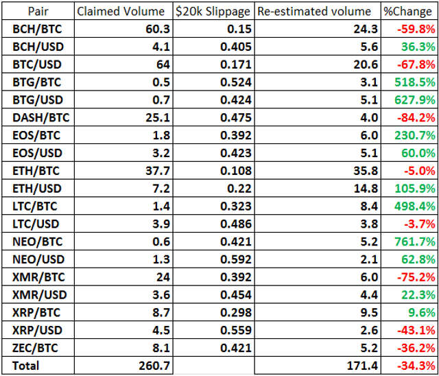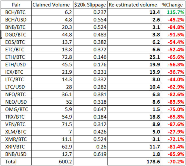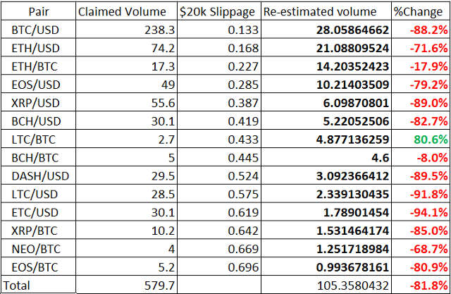 A proporção total de volume falsificado nesses pares seria, de acordo com este modelo, um escalonamento de 93,6%. Os pares descartados (slippage > 0,7%) não alterariam significativamente esse número de uma maneira ou outra.