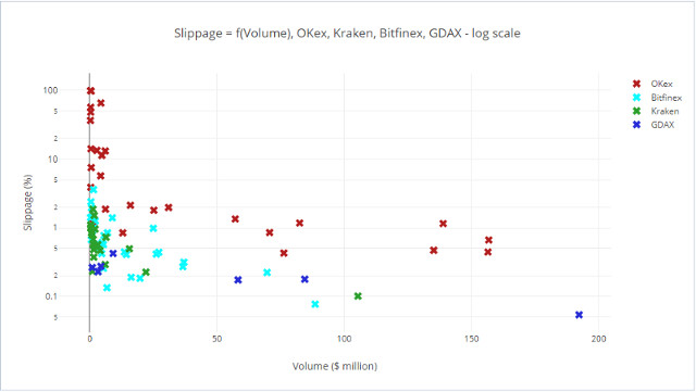 Slippage = f(Volume), OKex, Kraken, Bitfinex, GDAX