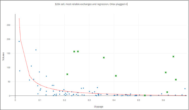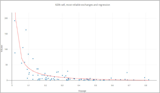 Observe que devido a dados extremamente voláteis, qualquer modelo torna-se absurdo quando o slippage excede 0,7%. O proposto acima é o melhor ajuste que eu criei para slippages abaixo de 0,7%. Sobre este limiar, a única suposição razoável é que o volume esperado é provavelmente inferior a US$ 1 milhão.