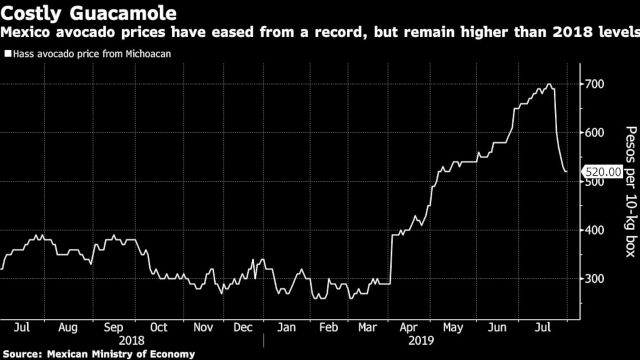 As tensões fronteiriças aumentaram o preços do avocado, uma variedade do abacate, do México, que responde por até 80% das importações dos EUA e é, de longe, o maior produtor mundial da popular fruta. Além disso, condições adversas em alguns pomares na região de Michoacan e uma safra menor na Califórnia levaram à falta do produto, o que elevou os preços da variedade Hass a um recorde em 18 de julho.