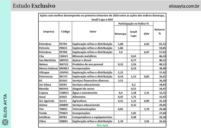 Mas o levantamento da Elos Ayta mostra que o trimestre foi mais do que um “trade de Petrobras”. Ele revela um rali amplo, porém altamente concentrado em vetores específicos, com 20 ações se destacando entre os índices Ibovespa, Small Caps e IDIV, combinando exposição a commodities, reprecificação de ativos domésticos e recuperação de setores sensíveis a ciclo.