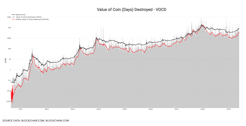 Extrapolando a partir do Bitcoin Days Destroyed, o experiente Hans Houge, da Ikigai, criou uma avaliação de USD (não BTC) com base no preço diário e alisou-a com uma média de 30 dias. Quando o MVOCD excede o preço, significa que mais Bitcoin Days estão sendo destruídos do que criados, o que significa que muito do Bitcoin que está sendo jogado agora está sendo movido pela rede.