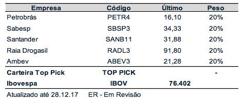 A carteira Top Pick da Socopa rendeu 28,34% no acumulado de 2017, ante ganhos de 26,86% do Ibovespa.