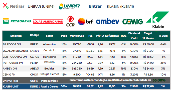 “Devido à forte valorização das ações da Unipar PNB no mês de fevereiro 2018, optamos por encerrar a recomendação neste momento com rentabilidade de 33% e incluir na Carteira Mensal da Terra Investimentos com peso de 10% as ações da Klabin Unit”, diz ele em relatório enviado a clientes.