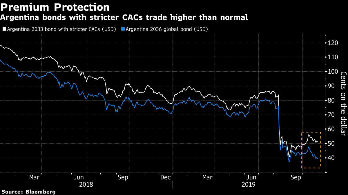 Embora a maior parte da dívida da Argentina agora seja negociada a cerca de 40 centavos de dólar – refletindo essencialmente as apostas de investidores na recuperação do valor -, alguns dos títulos denominados em dólar e euro com CACs mais rigorosas oferecem um prêmio de cerca de 10 centavos.