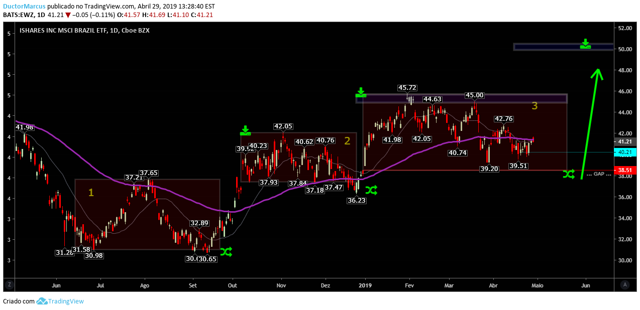Estou compartilhando o movimento na EWZ que está seguindo um padrão na minha forma de ver o mercado e foi confirmado por duas vezes. Se houver continuidade do movimento retangular com falsa perda de fundo o alvo é lá nos 50.