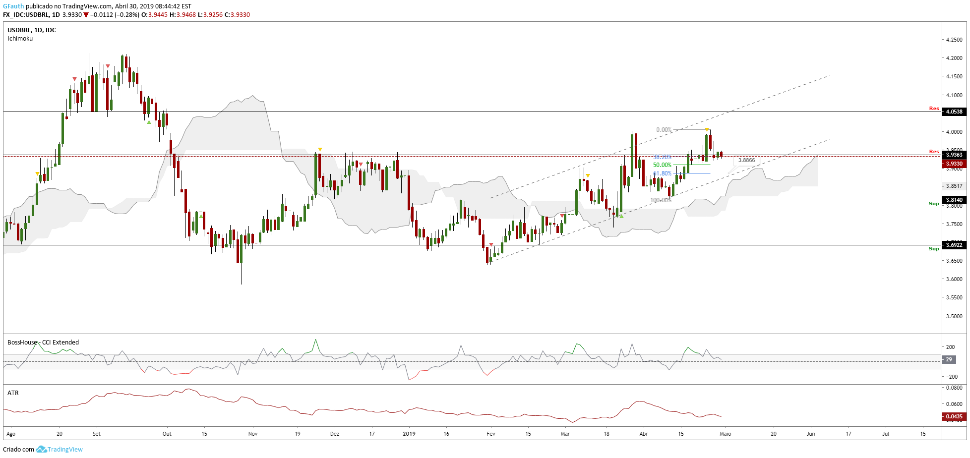 Do contrário, rompendo o suporte podemos voltar para a lateralização desse topo. Para iniciar uma tendência de baixa apenas ganhando valores abaixo de 3,69.