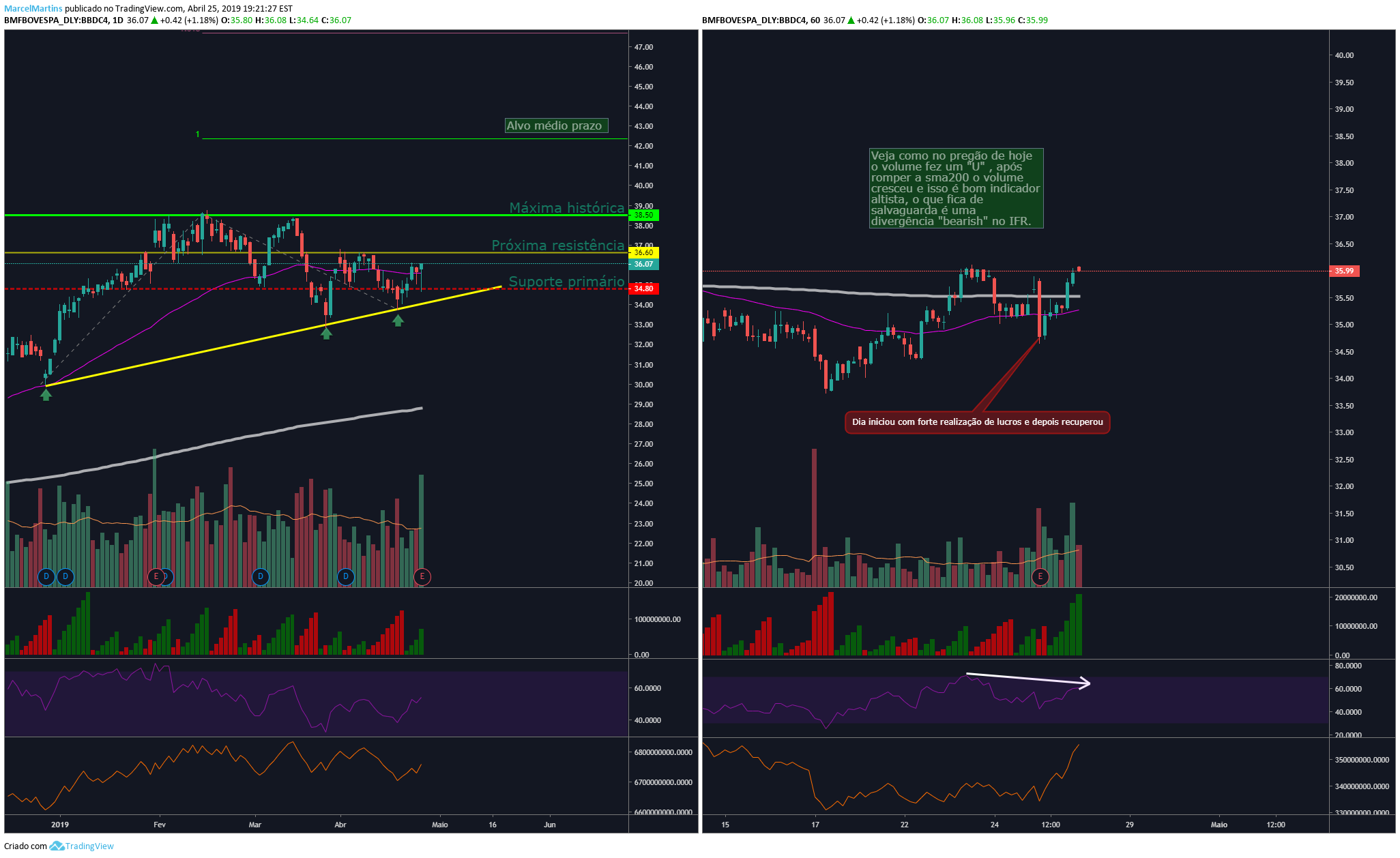 Para BBDC4 no Diário (esquerda) temos uma LTA confirmada por 3 toques e o preço hoje fechou acima de 50 EMA , o OBV confirma o movimento.