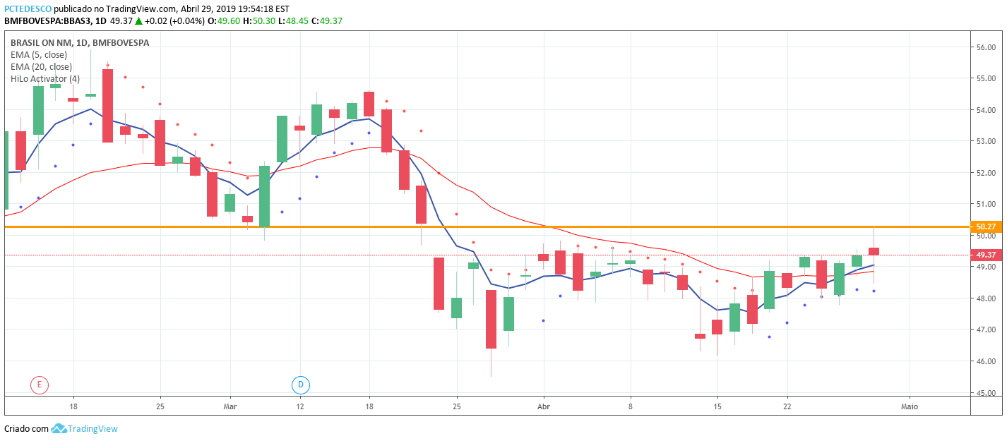 No entanto o ativo testou a resistência e acabou formando um candle de dúvida. A resistência dos R$ 50,27 é justamente uma região de abertura de gap. Apesar das médias móveis e do HiloActivator estarem comprados a formação de candles e a região de resistência inspiram correção negativa! (veja o gráfico dinâmico).
