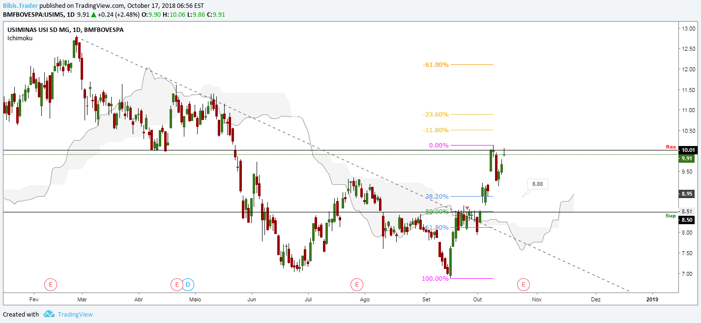 O preço da USIM5 avançou em reteste na resistência de R$10 e performou candle de rejeição ontem, o preço pode ter quedas nos próximos dias. Tracei uma fibonacci para facilitar encontrar o preço de retração, e 8,9 é um bom candidato, muita atenção para esse preço, ele está acima do atual suporte demarcado por mim confluente com 50% da fib.