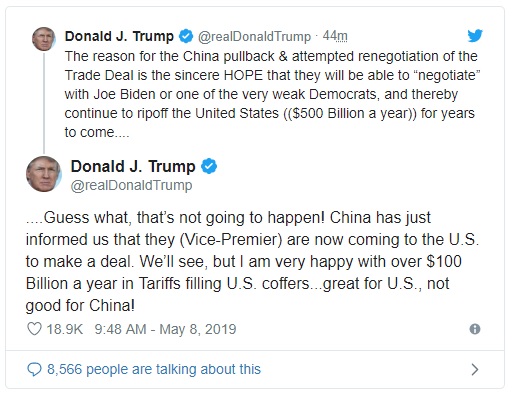 A declaração de Trump acalma os investidores em meio a temores crescentes em relação a absência de oficiais de alto escalão de Pequim nas negociações bilaterais.