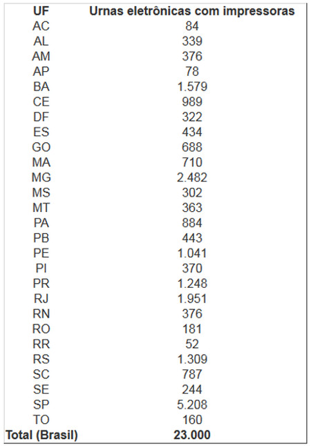 São Paulo, que reúne o maior eleitorado do país, com mais de 33,2 milhões de pessoas aptas a votar, é também o estado com o maior número de urnas eletrônicas equipadas com módulo de impressão: 5.208. Em seguida, aparecem Minas Gerais, com 2.482, e Rio de Janeiro, com 1.951. Roraima, que tem o menor número de eleitores no país, pouco mais de 328 mil pessoas, contará com urnas adaptadas em 52 seções eleitorais.